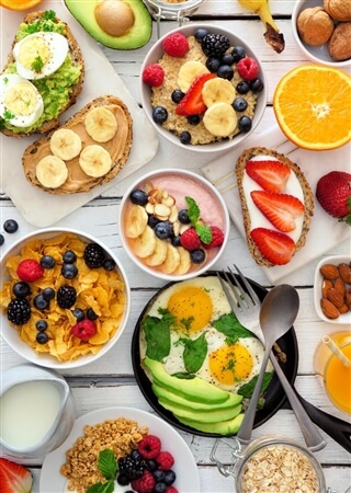 Many foods contribute to a nutritious and balanced breakfast, such as cereals, whole-grain toast, or porridge, as they are a primary source of carbohydrates essential for providing energy to the body.