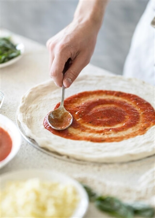 - Stendi la base: stendi l'impasto e distribuisci uniformemente la passata di pomodoro.